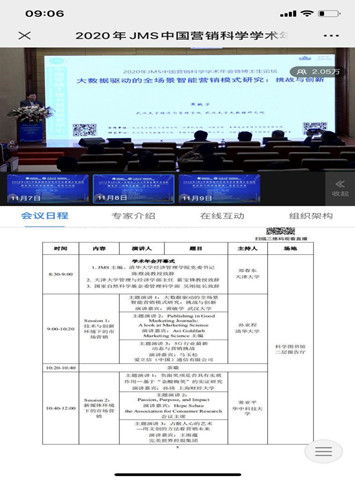 2020年11月7日至9日,学院市场营销与旅游管理系师生以线下和线上的方式同步参加了2020年JMS营销科学学术年会暨博士生论坛。本次会议以“新形势下的市场营销:变革与创新”为主题,由天津大学管理与经济学部承办,中国高校市场学研究会与中国管理现代化研究会营销专业委员会协办。本次会议采取线上线下同时进行的形式,共邀请了16位海内外营销领域知名学者发表了主题演讲,其中有营销领域国际顶级学术期刊Journal of Marketing、Journal of Marketing research、Marketing science、Journal of the Academy of Marketing Science的主编/联合主编,另有6位论文获奖的博士生在大会上进行了论文宣讲,共有超过42个分论坛198位青年学者参加了云端学术报告,另外还安排了青年学者与学术大咖一对一讨论环节,给众多国内外学者提供了面对面交流学习机会。