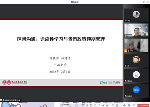 2022年12月1日上午,由yL23411永利官网登录金融系、金融研究中心、金融发展与政策研究中心及金融工程与风险管理研究中心共同主办的景林珞珈金融论坛第226期在腾讯会议平台通过线上方式举行,中山大学林建浩教授为永利官网师生带来了题为“区间沟通、适应性学习与货币政策预期管理”的学术报告。讲座由金融系李斌老师主持,三十余名师生参加论坛。