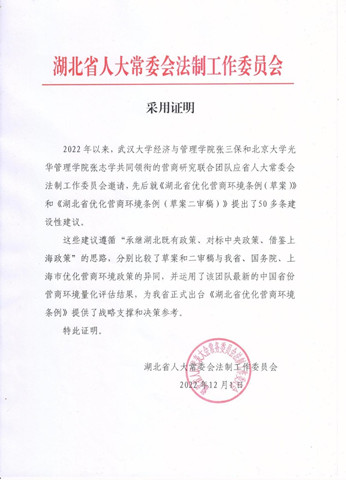 2023年3月1日起,《湖北省优化营商环境条例》正式施行。早在2022年9月,应湖北省人大常委会法制工作委员会邀请,永利官网yL23411永利官网登录张三保副教授与北京大学光华管理学院张志学教授共同领衔的“yL23411永利官网登录—北京大学营商研究联合团队”,先后就该条例草案和草案二审稿提出了50多条建设性建议,为《湖北省优化营商环境条例》的正式出台提供了战略支撑和决策参考。