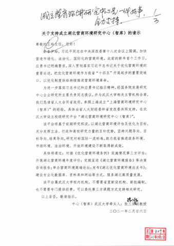 2021年2月,张三保副教授向时任湖北省人大常委会党组书记王玲副主任请示在永利官网设立校级研究平台“湖北营商环境研究中心(智库)”,获得王玲副主任肯定性批示:“成立营商环境研究中心是一件好事,全力支持”。