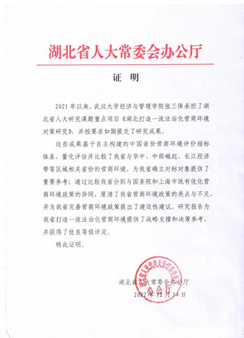 2021年,张三保副教授承担并如期完成了湖北省人大研究课题重点项目《湖北打造一流法治化营商环境对策研究》。这些成果为湖北省打造一流法治化营商环境提供了战略支撑和决策参考,获得湖北省人大常委会办公厅优良等级成果评定。