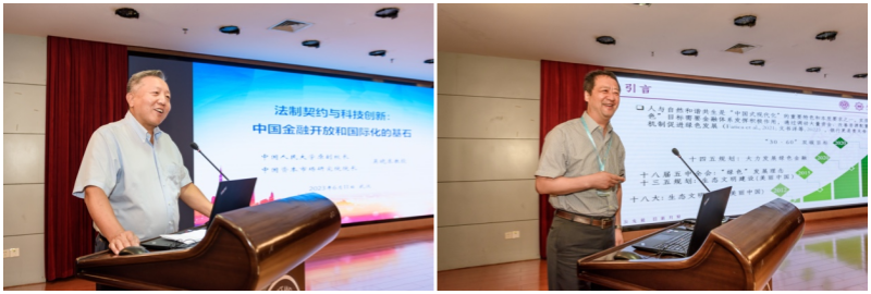 本届论坛的主旨演讲在yL23411永利官网登录A120举行,上下半场分别由金成武主任、yL23411永利官网登录金融系主任李斌主持。上半场,吴晓求教授首先作题为“法制契约于科技创新:中国金融开放和国际化的基石”的演讲。他将中国式现代化最核心的两大支点概括为经济的可持续增长和法制的现代化,认为经济的可持续增长需要依靠有中国特色的社会主义市场经济体制和模式,以及科技进步基础上的产业升级和迭代来保障与推动。随后,梁琪教授作题为“‘绿色溢价’谁获益?商业银行绿色治理的贷款溢价效应研究”的汇报,利用手工收集的中国上市公司贷款数据和我国银行绿色治理指数构建,考察了银行绿色治理对信贷定价的影响。研究发现,银行绿色治理会通过绿色声誉效应和绿色成本效应提高其信贷定价,且这一效应在银行端绿色治理类型和企业端绿色表现上存在异质性。