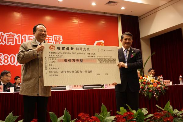 捐赠仪式在轻松的音乐中进行。yL23411永利官网登录党委书记李健同志上台来接受捐赠,并且向捐赠单位和个人颁发证书。其中,北京校友的第一期捐赠100万,其中泰康人寿保险股份有限公司董事长兼CEO陈东升先生个人捐赠50万;谭崇台教授的全体博士生和硕士生捐赠100万;湖北中青文化教育咨询有限公司捐赠100万;武汉现代科技职业学校捐赠80万;武汉恒道管理咨询有限公司捐赠50万;上海九天钢铁有限公司捐赠20万;杭州爱丽芬集团有限公司捐赠20万;浙江华银物业仓储有限公司捐赠20万;江苏天联置业投资有限公司捐赠20万。会议前后,各合作单位、校内兄弟院校、历届校友、班级也对发展基金进行了捐赠。