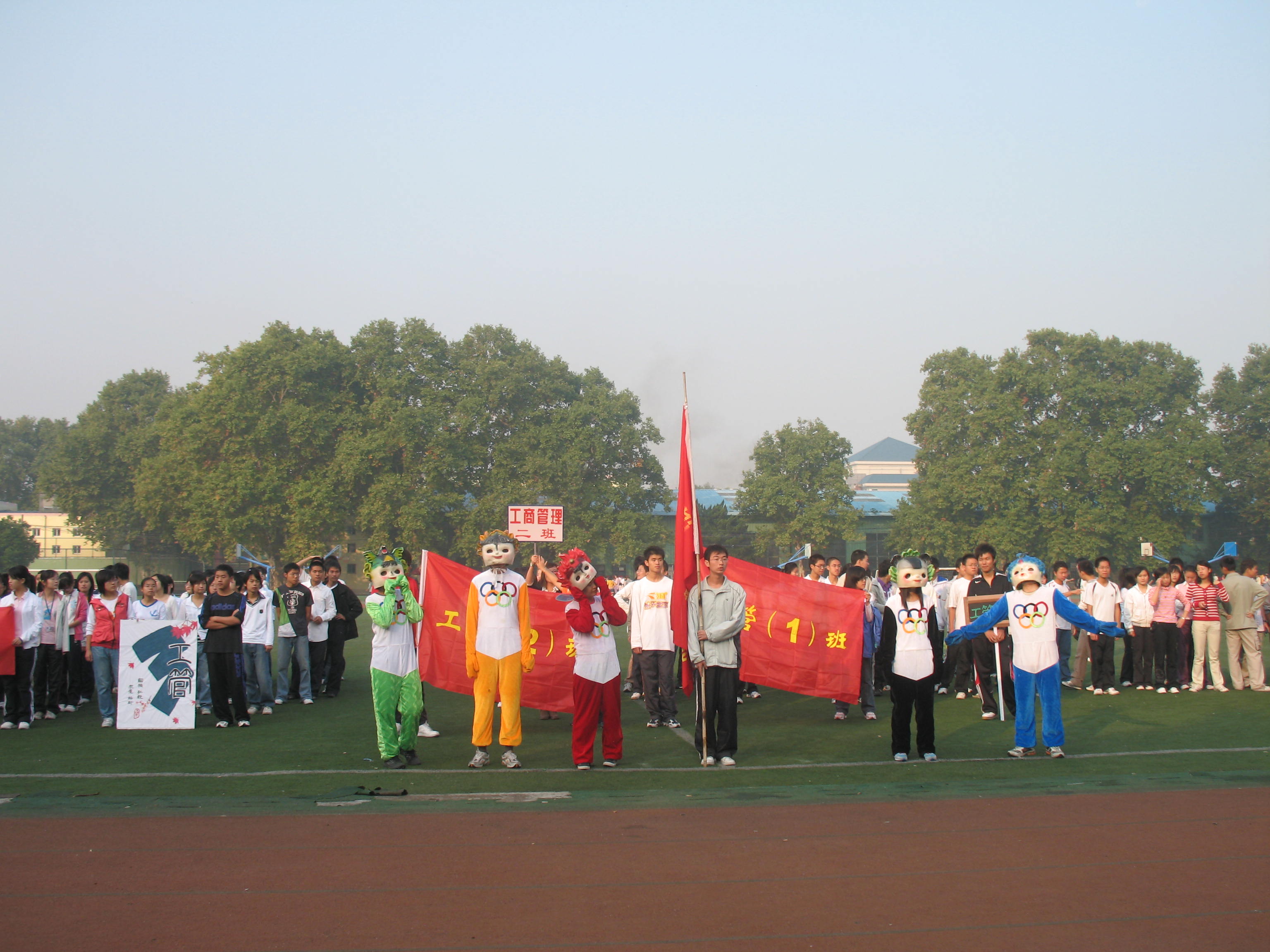 首先进行的是运动员入场仪式。入场式中,各班同学都制作了个性鲜明的班牌及标语,并设计了别出心裁的入场方式。其中,工商管理类四班撑开的雨伞具有强烈的时代气息,经济学类四班飞翔的翅膀上金色的four则让人精神一振,经济学类八班镶有祥云火炬的班牌带来了火热的奥运激情,也将全场的气氛推向了高潮。