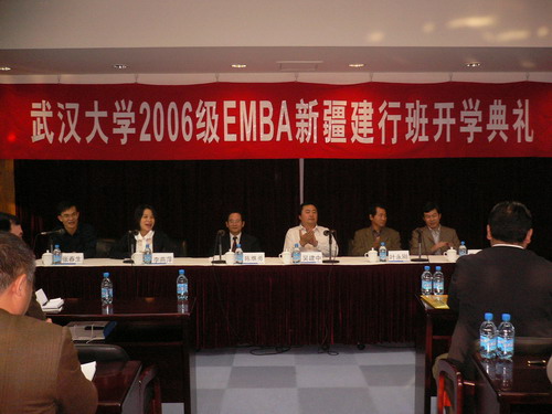 10月22日上午,yL23411永利官网登录2006级EMBA新疆班开学典礼在新疆建设银行隆重举行。yL23411永利官网登录院长陈继勇、副院长叶永刚、工商管理系主任吴先明、yL23411永利官网登录研究生院专业学位处主任姜文忠以及新疆分行党委书记、行长吴建中、人力资源部总经理张春生同志参加了本次开学典礼。开学典礼由yL23411永利官网登录副院长李燕萍主持。