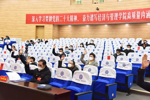 赵雪梅指出,开好这次党代会,对于我们认清目前面临的形势和任务、机遇和挑战,科学谋划今后五年乃至更长时间的发展战略和目标任务,进一步凝聚广大师生员工的智慧和力量,推动学院高质量发展具有十分重要的意义。她对学院未来发展提出了三点希望:一是持续掀起学习宣传贯彻党的二十大精神的热潮。党的二十大闭幕后,学院党委与人文社会科学研究院联合举办“新时代 新理论 新实践 新发展:学习阐释党的二十大精神学术研讨会”,起到了较好的示范作用。接下来,要按照学校党委统一部署,紧密结合党中央即将在全党开展的主题教育,面向全体党员开展多形式、分层次、全覆盖的全员培训,引导全体党员原原本本、逐字逐句学习党的二十大报告和党章,推动全体党员深刻领悟“两个确立”的决定性意义,增强“四个意识”、坚定“四个自信”、做到“两个维护”,以实际行动践行对党忠诚。二是要持续增强党组织的政治功能和组织功能。学院党委要坚持以党的政治建设为统领,一体推进“造形”和“铸魂”,持续完善上下贯通、执行有力的组织体系,更好地把党员组织起来、把人才凝聚起来、把师生动员起来,推动党建与业务工作深度融合。要牢固树立“一切工作到支部”的鲜明导向,着力加强党支部标准化规范化建设,把基层党组织建设成为有效实现党的领导的坚强战斗堡垒。三是要坚持以高质量党建引领高质量发展。学院党委要全面贯彻落实党的教育方针,落实立德树人根本任务,持续深化“三全育人”综合改革,着力提升人才培养水平。要围绕经济社会发展需要、国家重大战略急需,充分发挥理论经济学一流学科的引领作用,进一步统筹构建学科发展新格局,培育新兴交叉学科,努力打造新的学科增长点。要以更高水平、更高质量推进实施人才强校、人才强院战略,加大人才引育力度,全力营造识才爱才敬才用才的良好环境。